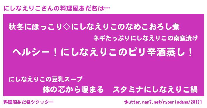 | 男性向けラノベタイトル風あだ名 | 『Re:にしなえりこから始める異世界生活』 |