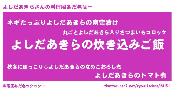 | ヒーロー風カッコイイあだ名 | 『スーパーヨシダアキラ』『仮面ヨシダー』 |