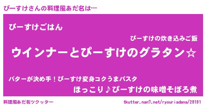| 女子向けラノベタイトル風あだ名 | 『ぴーすけ伯爵の花嫁』『ぴーすけ恋絵巻』 |