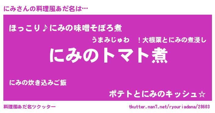 | 女子向けラノベタイトル風あだ名 | 『にみ夫妻のなれそめ』『にみの婚約者』 |