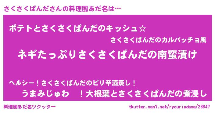 | 男性向けラノベタイトル風あだ名 | 『サクサクパンダアートオンライン』 |