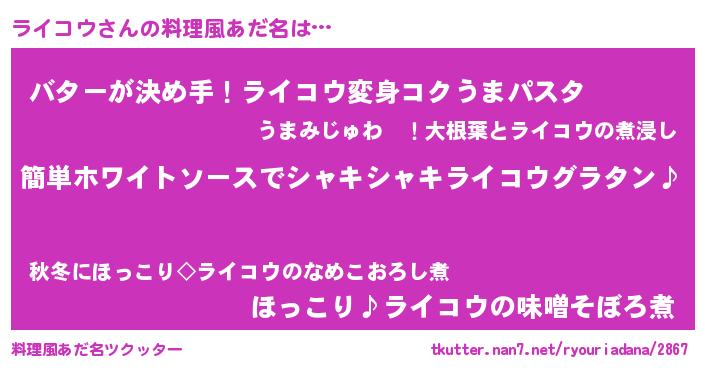 | 女子向けラノベタイトル風あだ名 | 『ライコウ様がみてる』『ライコウ恋絵巻』 |