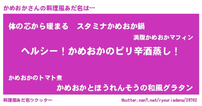 | 男性向けラノベタイトル風あだ名 | 『Re:かめおかから始める異世界生活』 |