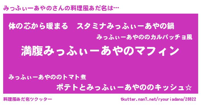 | 胡散臭い通販商品みたいなあだ名 | 『絶対に幸福をもたらす健康食品…その名も「みっふぃーあやの」』 |