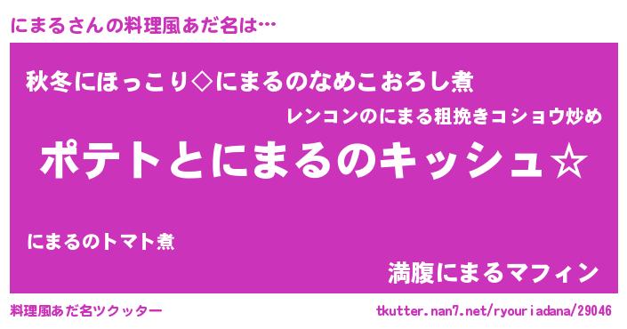 | 女子向けラノベタイトル風あだ名 | 『にまるの卵を拾いまして』 |