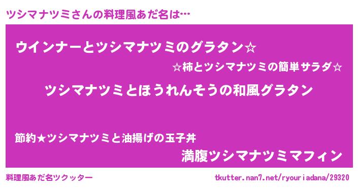 | 男性向けラノベタイトル風あだ名 | 『ツシマナツミ~年齢イコール彼女いない歴の魔法使い~』 |