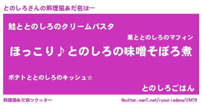 | 男性向けラノベタイトル風あだ名 | 『とのしろの憂鬱』『トノシロスレイヤー』 |