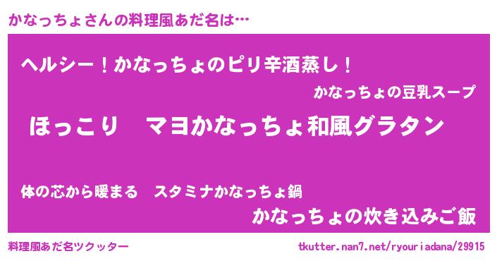 | 男性向けラノベタイトル風あだ名 | 『この素晴らしい世界にかなっちょを!』 |