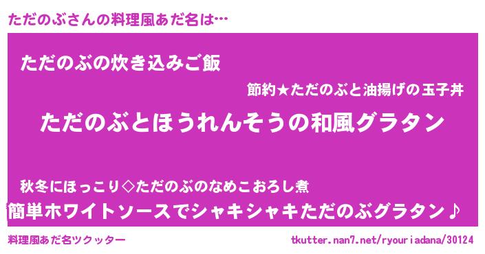 | 男性向けラノベタイトル風あだ名 | 『ただのぶ~年齢イコール彼女いない歴の魔法使い~』 |