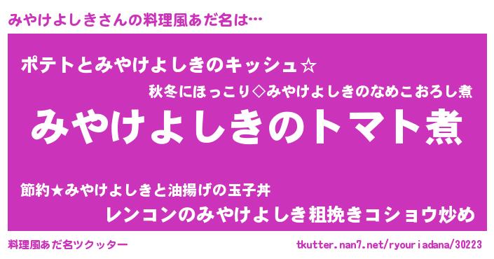 | ヘコむあだ名 | 『みや太郎』『みやにー』『酢こんぶ』 |
