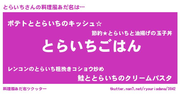 | 胡散臭い通販商品みたいなあだ名 | 『信頼と実績のサプリメント…その名も「とらいち」』 |