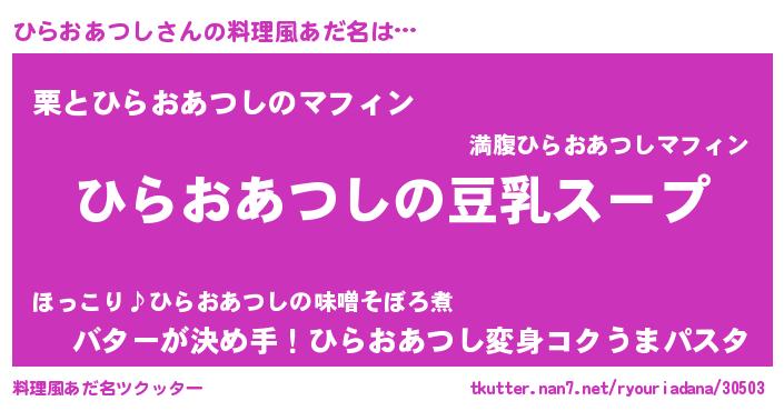 | 胡散臭い通販商品みたいなあだ名 | 『信頼と実績のサプリメント…その名も「ひらおあつし」』 |