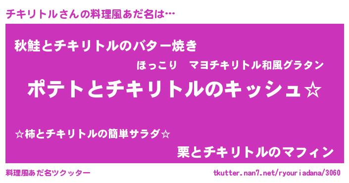| 男性向けラノベタイトル風あだ名 | 『チキリトルの嫁は女の子じゃないと思った?』 |