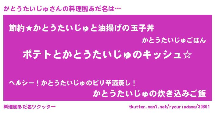 | 女子向けラノベタイトル風あだ名 | 『かとうたいじゅの卵を拾いまして』 |