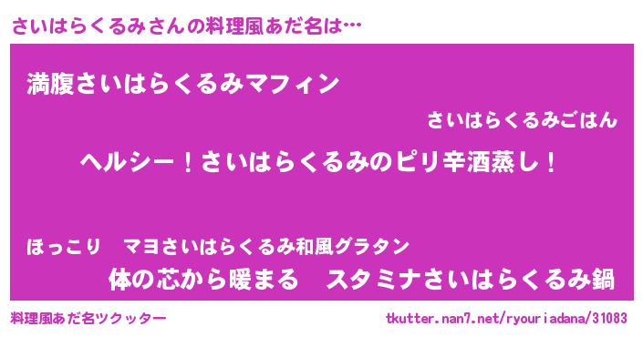 | 意味不明あだ名 | 『自称さいはらくるみ』 |