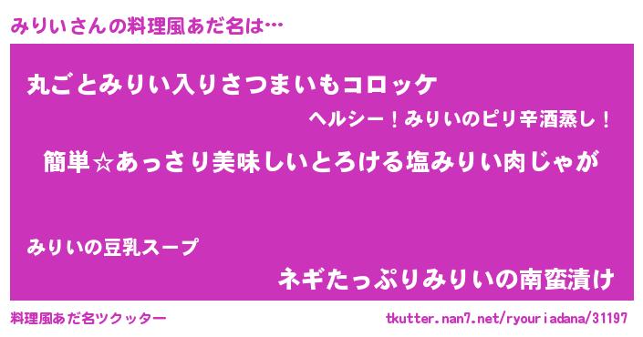 | 意味不明あだ名 | 『永久保存みりい』『ペロリンみりい』 |