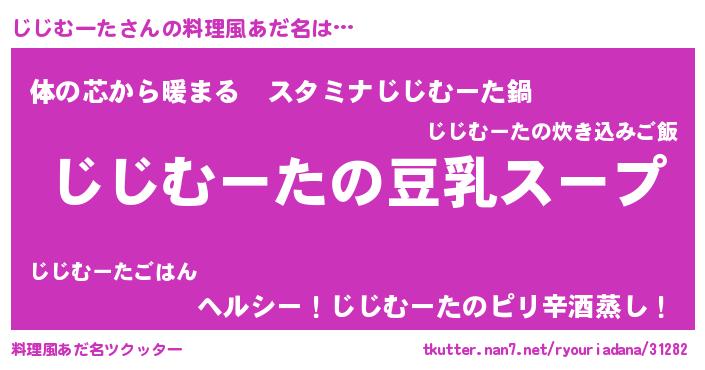 | 胡散臭い通販商品みたいなあだ名 | 『信頼と実績のサプリメント…その名も「じじむーた」』 |