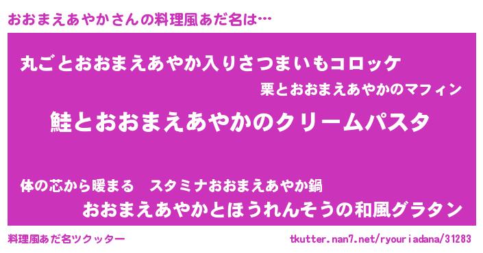 | 女子向けラノベタイトル風あだ名 | 『死神おおまえあやかの再婚』 |