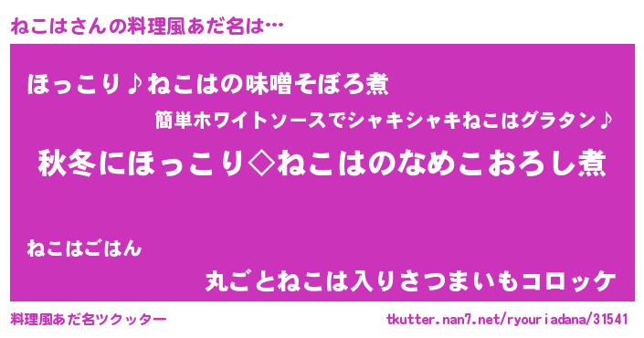 | 男性向けラノベタイトル風あだ名 | 『ねこはに滅ぼされるだけの簡単なお仕事です』 |