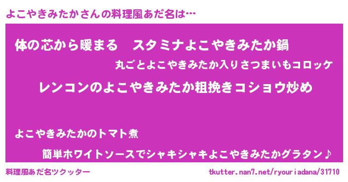 | 意味不明あだ名 | 『自称よこやきみたか』 |