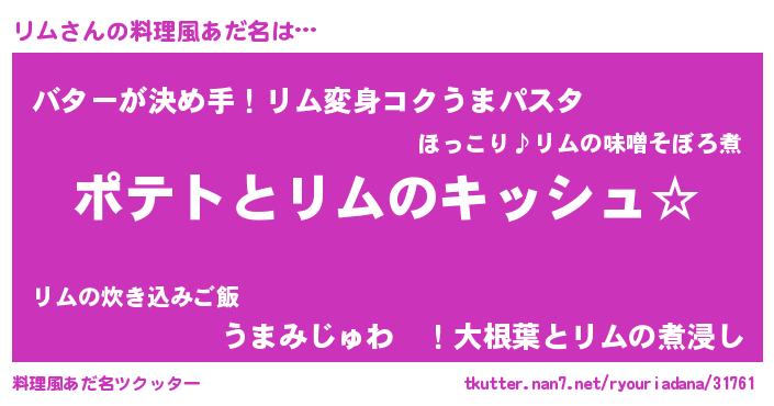 | 女子向けラノベタイトル風あだ名 | 『リムの卵を拾いまして』『リム恋絵巻』 |