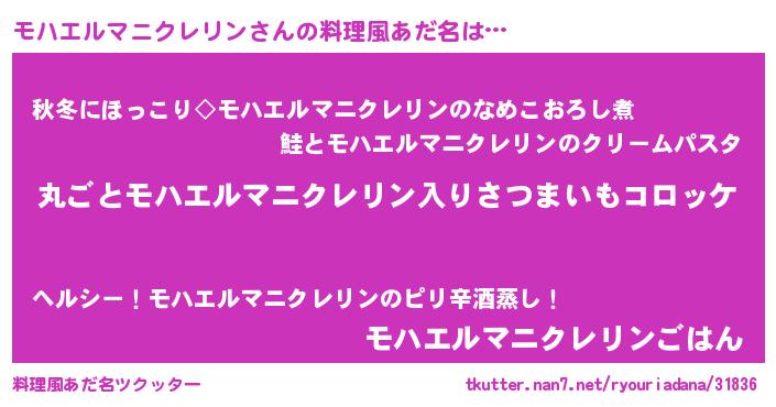 | 男性向けラノベタイトル風あだ名 | 『魔弾の王とモハエルマニクレリン』 |