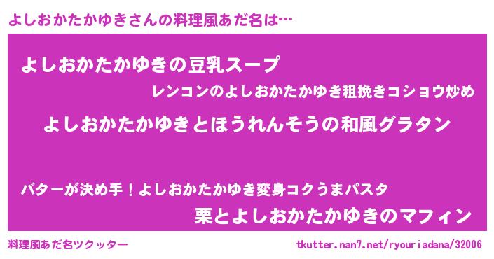 | 男性向けラノベタイトル風あだ名 | 『よしおかたかゆき~年齢イコール彼女いない歴の魔法使い~』 |