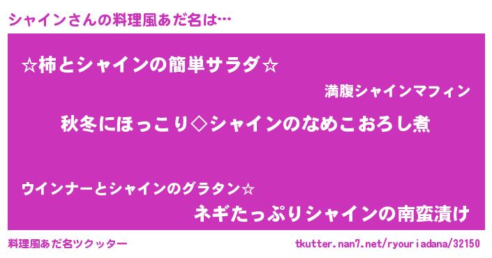 | 男性向けラノベタイトル風あだ名 | 『シャインに滅ぼされるだけの簡単なお仕事です』 |