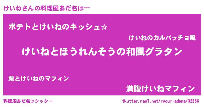 | 男性向けラノベタイトル風あだ名 | 『けいね~年齢イコール彼女いない歴の魔法使い~』 |