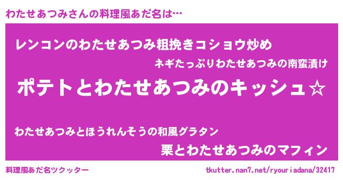 | 女子向けラノベタイトル風あだ名 | 『わたせあつみの卵を拾いまして』 |
