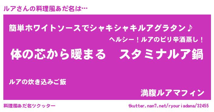 | 女子向けラノベタイトル風あだ名 | 『ルアの雑貨屋さん』『ルア様がみてる』 |