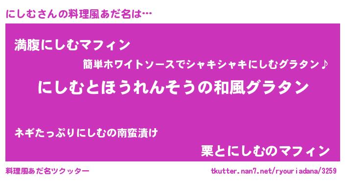 | 男性向けラノベタイトル風あだ名 | 『にしむ~年齢イコール彼女いない歴の魔法使い~』 |
