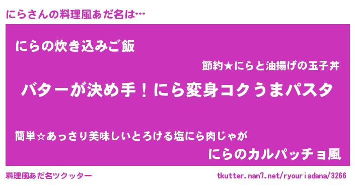 | 女子向けラノベタイトル風あだ名 | 『にら恋絵巻』『男装にらの憂鬱な任務』 |