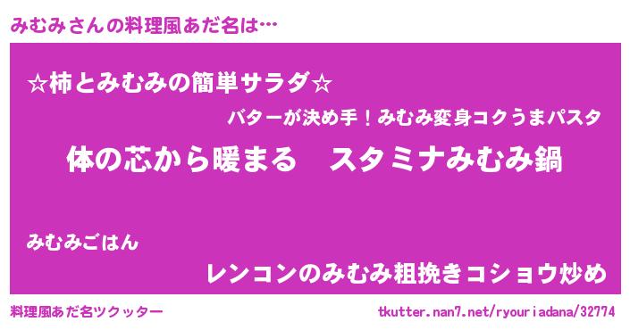 | 女子向けラノベタイトル風あだ名 | 『みむみの雑貨屋さん』『みむみ恋絵巻』 |