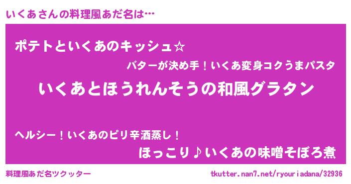 | 女子向けラノベタイトル風あだ名 | 『いくあの玉の輿計画!』『いくあ恋絵巻』 |