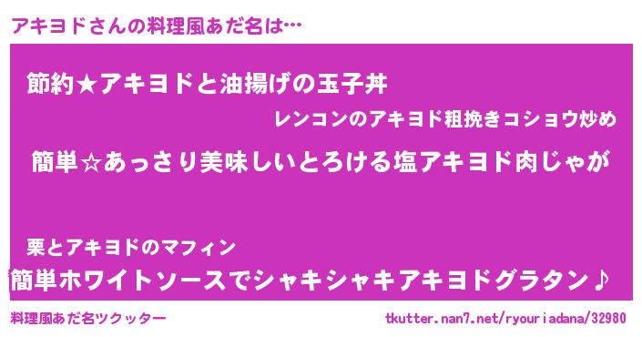 | 意味不明あだ名 | 『永久保存アキヨド』『ペロリンアキヨド』 |