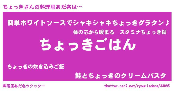 | 胡散臭い通販商品みたいなあだ名 | 『信頼と実績のサプリメント…その名も「ちょっき」』 |
