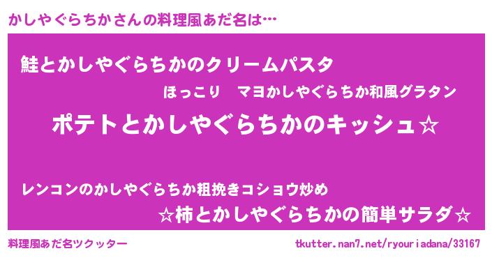 | 女子向けラノベタイトル風あだ名 | 『かしやぐらちかの卵を拾いまして』 |
