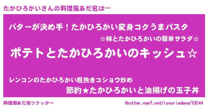 | 女子向けラノベタイトル風あだ名 | 『たかひろかいの卵を拾いまして』 |