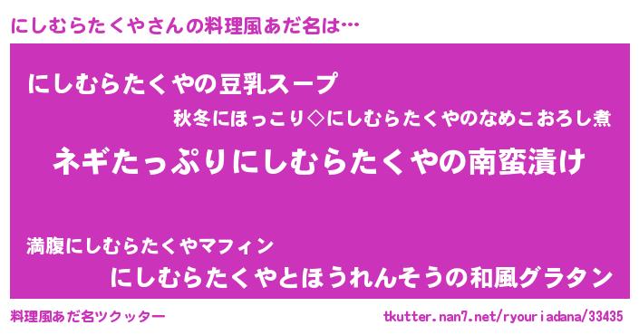 | ポケモン風あだ名 | 『ニシチュウ』『ヒニシムラタクヤ』 |
