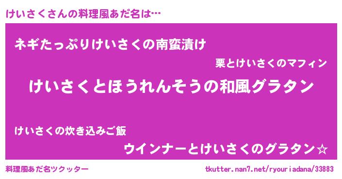 | 男性向けラノベタイトル風あだ名 | 『けいさく~年齢イコール彼女いない歴の魔法使い~』 |
