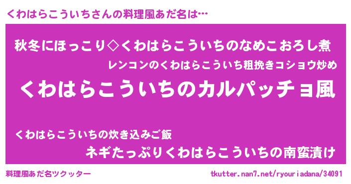 | 男性向けラノベタイトル風あだ名 | 『魔弾の王とくわはらこういち』 |