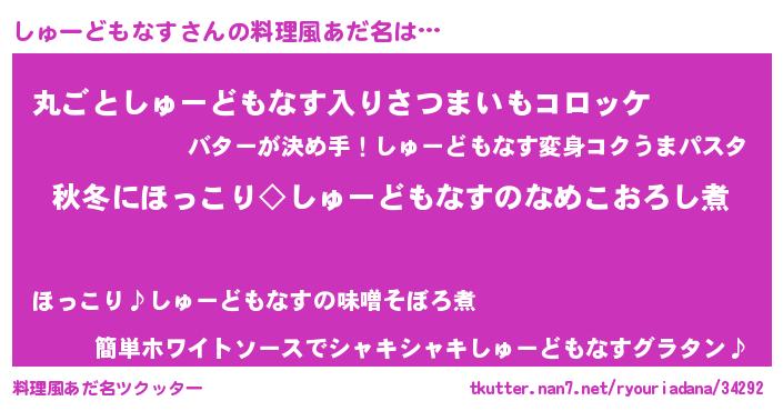 | 男性向けラノベタイトル風あだ名 | 『しゅーどもなすに滅ぼされるだけの簡単なお仕事です』 |