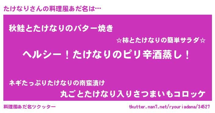 | 男性向けラノベタイトル風あだ名 | 『Re:たけなりから始める異世界生活』 |