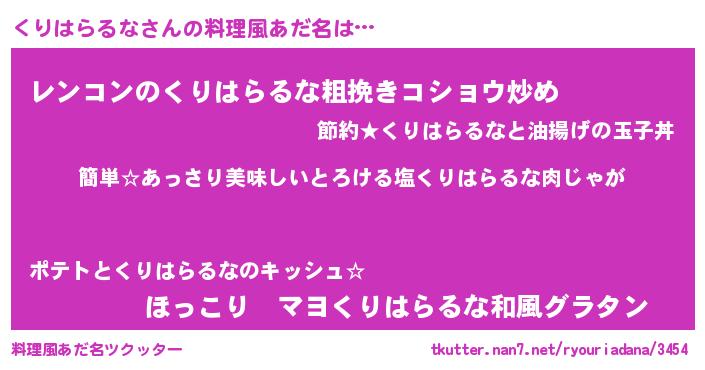 | ヘコむあだ名 | 『くりはらるな(笑)』『くりもー』 |
