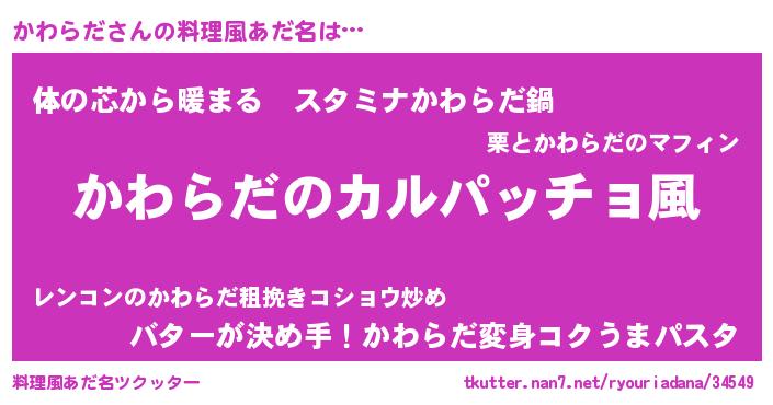 | 女子向けラノベタイトル風あだ名 | 『かわらだが死なない童話 林檎のかわらだの診療簿』 |