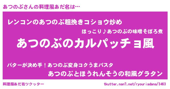 | ヒーロー風カッコイイあだ名 | 『仮面アツダー』『超時空戦士アツノブ』 |