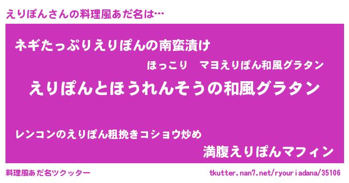 | 男性向けラノベタイトル風あだ名 | 『えりぽん~年齢イコール彼女いない歴の魔法使い~』 |