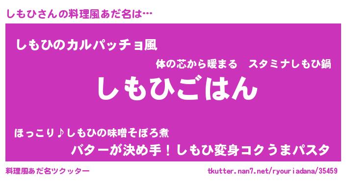 | 意味不明あだ名 | 『めかぶ科しもひ属』『ペロリンしもひ』 |