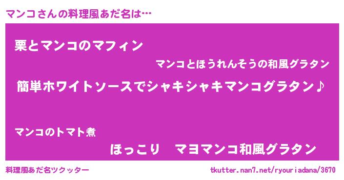 | 男性向けラノベタイトル風あだ名 | 『マンコの嫁は女の子じゃないと思った?』 |